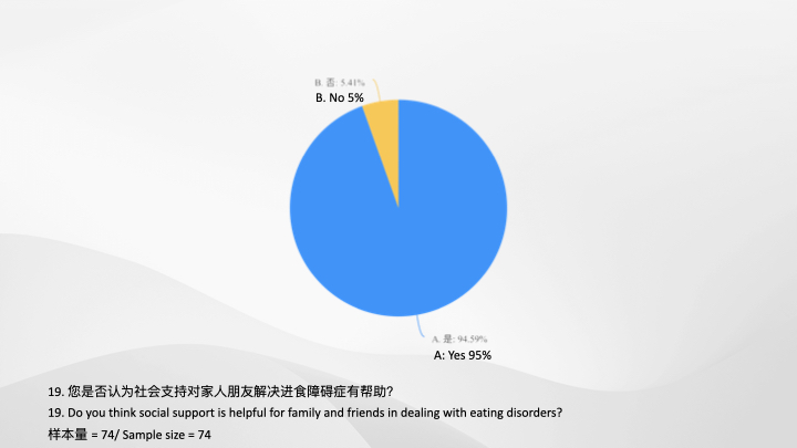 The questionnaire received 96 simple. Most participants were from the Southeast Coast in China. 50% were aware of eating disorders, 7% had suffered from or were experiencing an eating disorder, and 15.62% were unsure if they had an eating disorder. In the eating disorder group questionnaire, with a sample of 22, 59% were unwilling to tell others that they had an eating disorder, but 64% were ready to receive professional treatment.